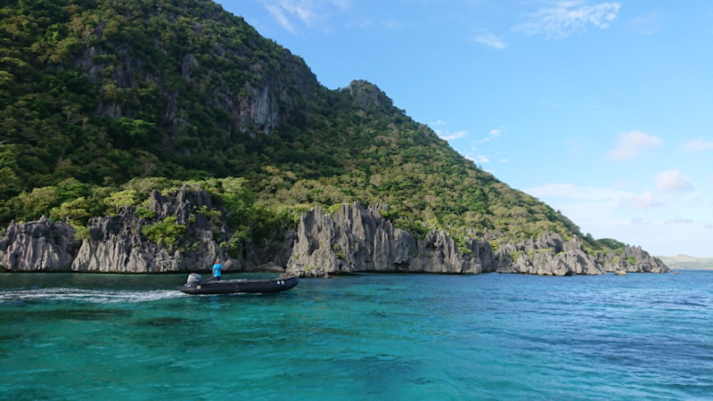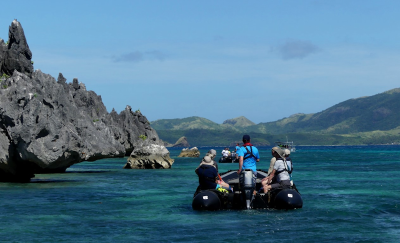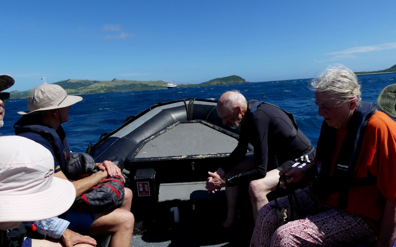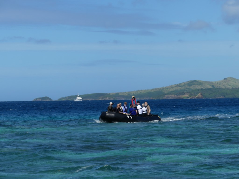 A zodiac does a recce of the coastal areas to determine the best site for snorkelling and swimming.