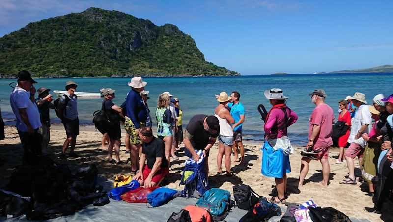 The shore party arrives on the beach from where morning swimming or snorkelling activities will be based.
