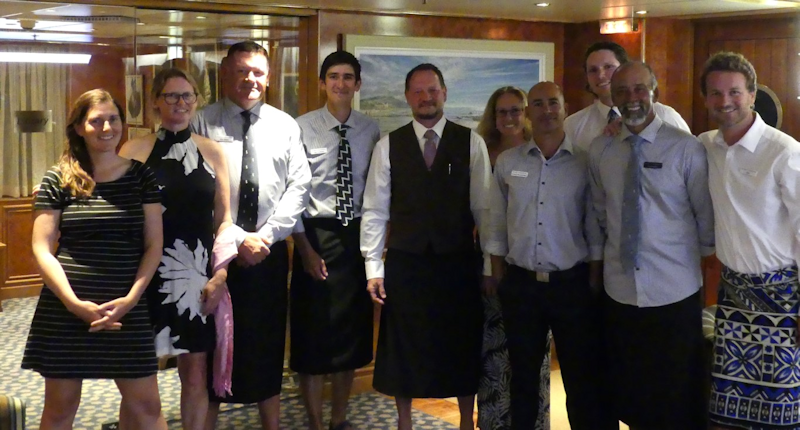 This is a group photo of the entire expedition crew (zodiac drivers) dressed in suitable Fijian style evening wear as we sailed west towards Vanuatu.