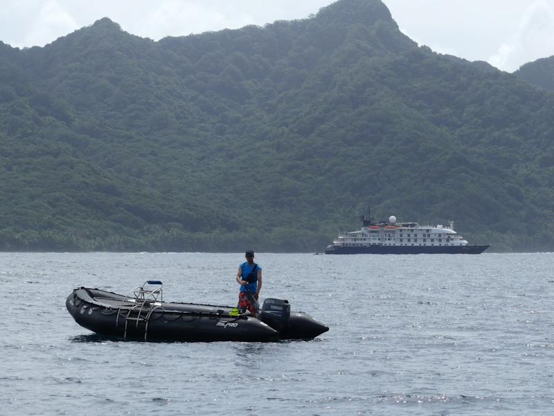 The Island Sky is manoeuvres to a drift position off the island as the scout Zodiac crews assess the sea and landing conditions.