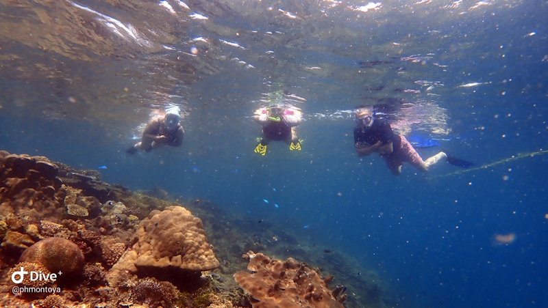Three snorkellers, taken with an underwater camera.
