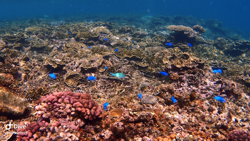 Some bright blue fish amongst the coral.