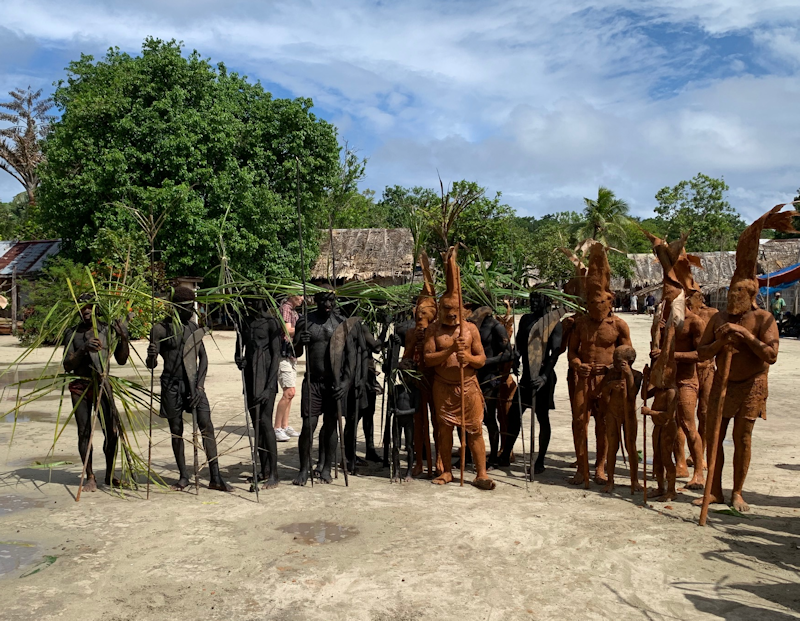 Two groups of men do a dance performance emulating a black group (Melanesians) chasing away a brown group (Polynesians).