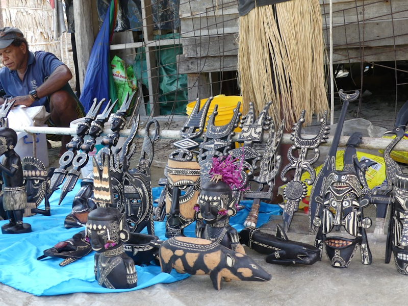 Carved masks, figurines and animals of exceptional quality are displayed for sale.