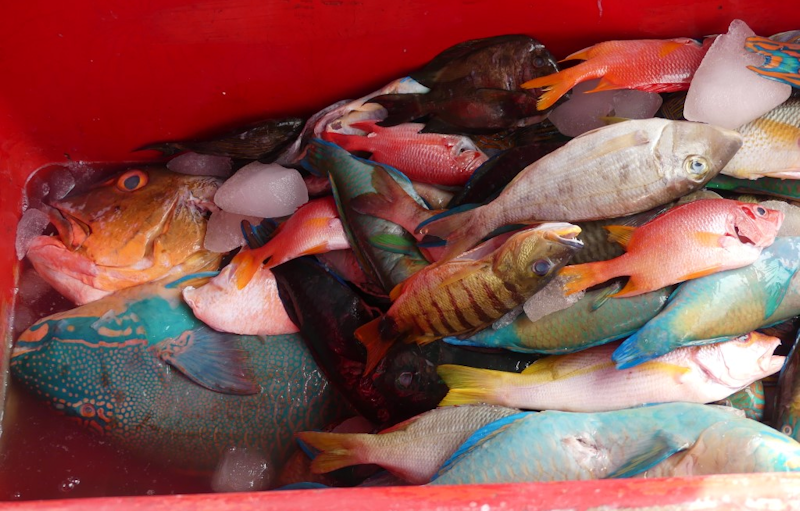 ...and not forgetting the fish market, with huge frozen tuna, shellfish and this odd box of assorted colourful fish.