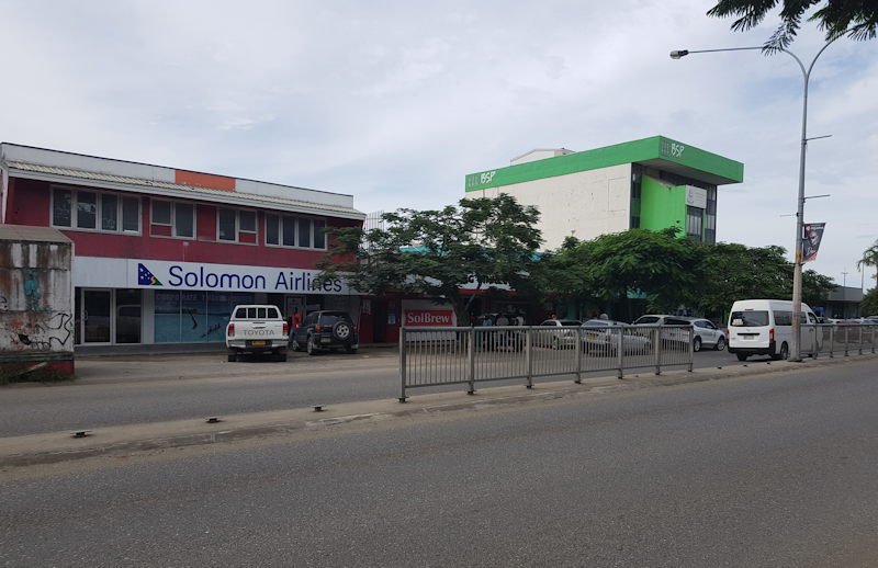 A bit further on, the large green building is the BSP (Bank of the South Pacific).