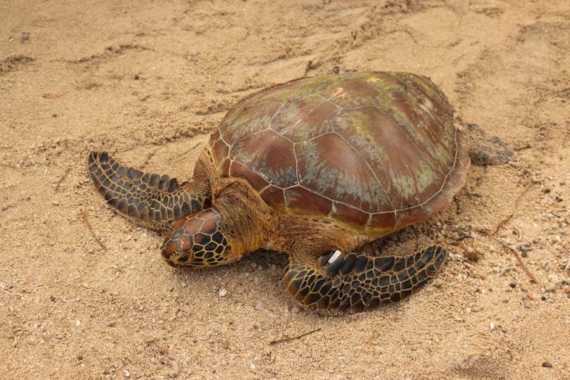 A turtle with its tag is released and makes its way down to the sea.