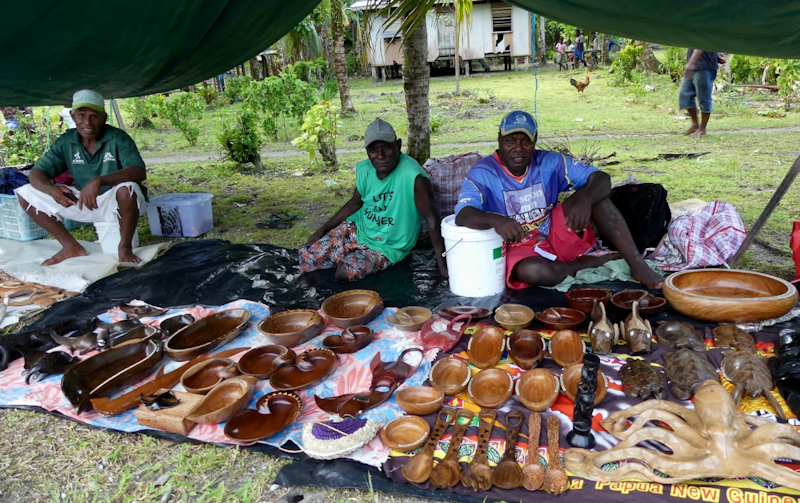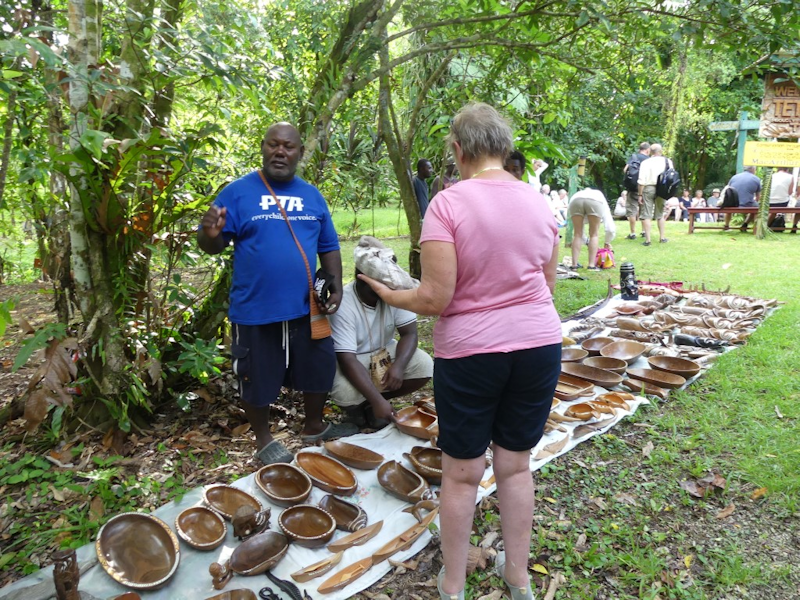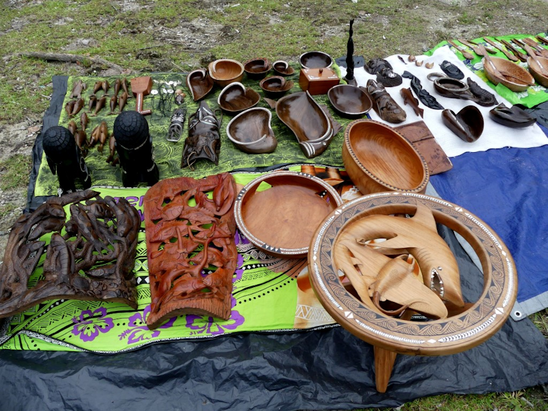 Arriving at Mbili village, around the village square there are several displays of fine quality wood carvings - here is one of them, including bowls, spoons, turtles and an octopus.