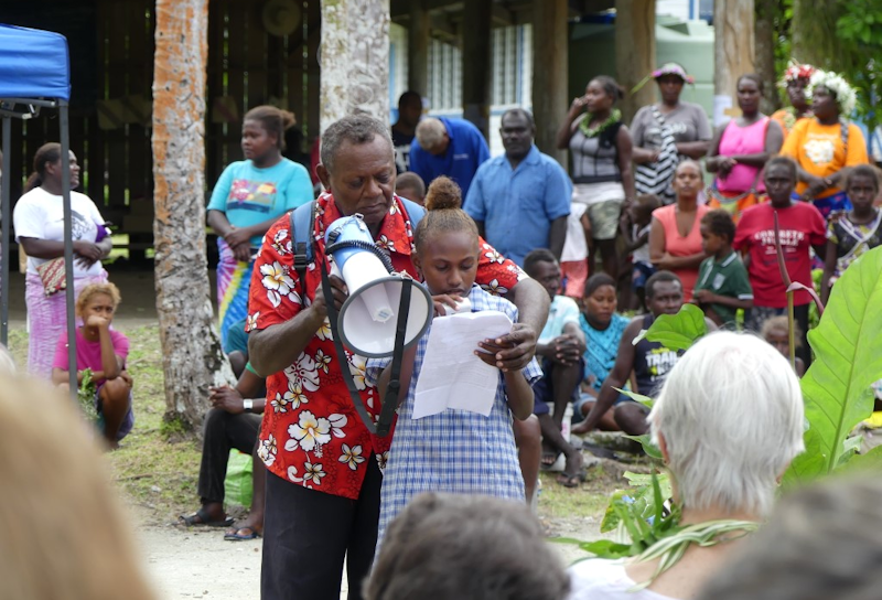 The village leader assists a local girl to recite a welcome in her best English to us guests.