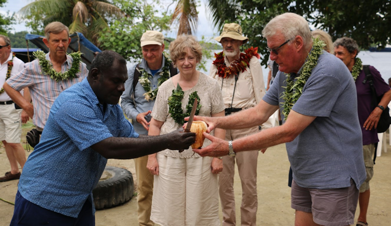 Coconut drinks are offered to all the passenger visitors. I'm standing behind with my frangipani garland - local children gave one of these to all of us as we were seated before the ceremony, it was a lovely gesture.