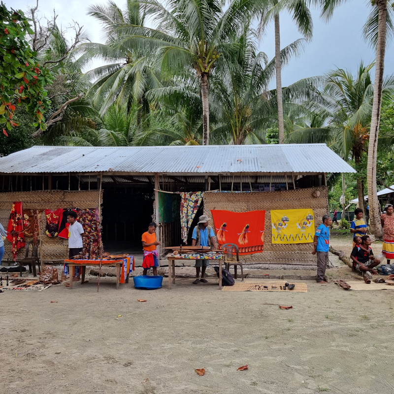 On shore, villagers are selling their wares - clothing, wood carvings and so on near the village.