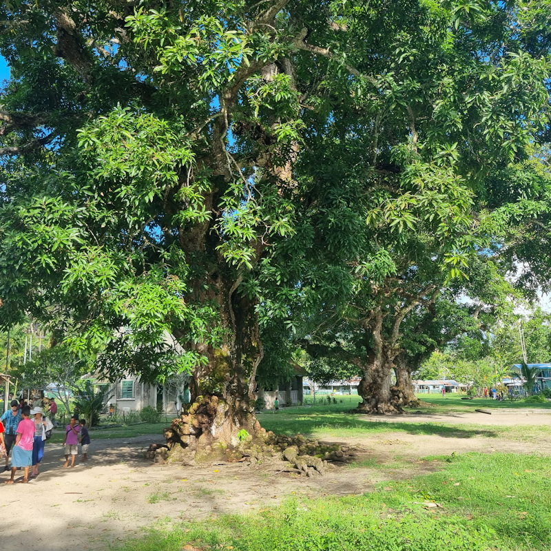 A trio of huge old gnarled trees edging the village.