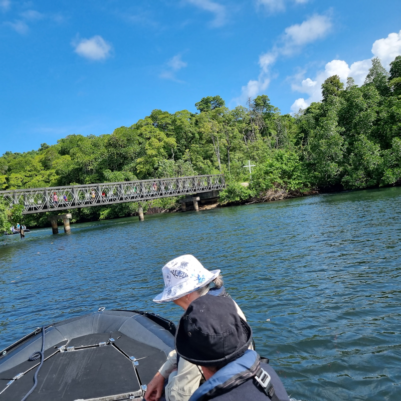 The bailey bridge leading to the village. We passed under it twice during our Zodiac cruise.