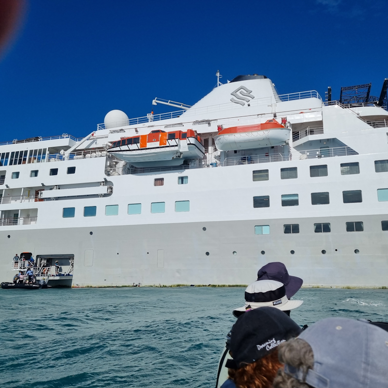 Our final ride on a zodiac as we head back to the ship, the starboard platform on the starboard side is where we would board and disembark from the boats.
