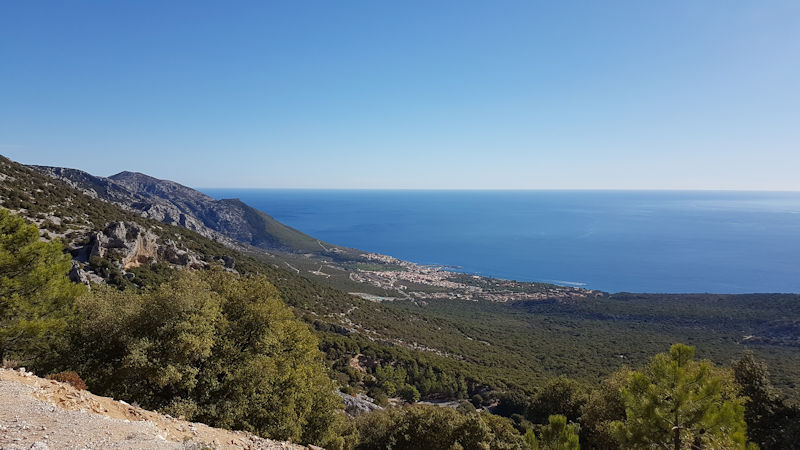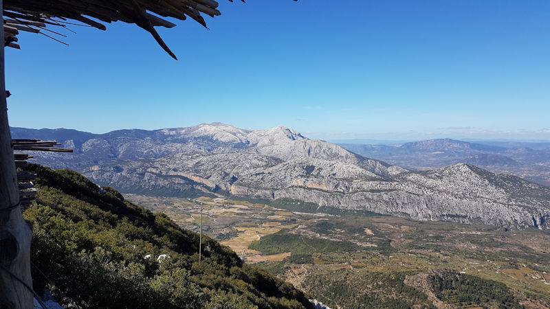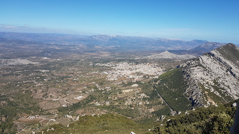 | (3) At the summit we had lunch in a seating area near the manned fire watch station. There are spectacular views to the north. The town of Dorgali is down there at the centre right. | ![]() |