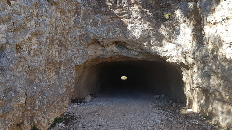 Walk 1: [Monte Tului, near Dorgali] Just outside of Dorgali we walk through a hand made tunnel through a ridge to access the rear of the mountain we are going to climb. It is Monte Tului, which has a huge transmitter on its summit. |