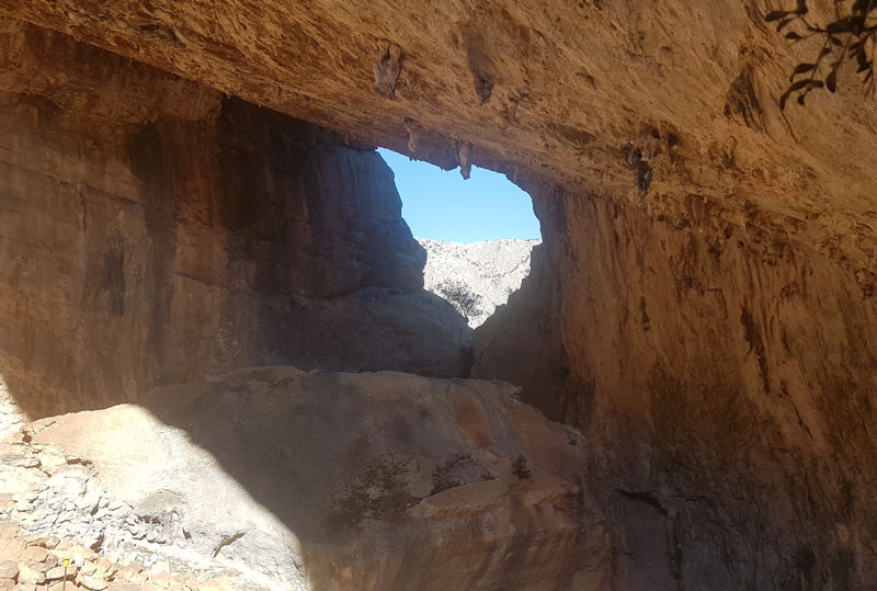| (25) We reached Tiscali and explored around it. This was an ancient village built within a collapsed limestone gallery. In this photo the natural window gives a view outside. | ![]() |