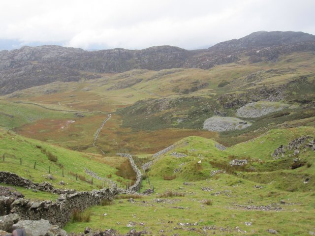 (4) A view of old mine works and drystone walls as we head up towards our second peak - Cnicht [2260'] on another windy and low visibility climb (Day 2)