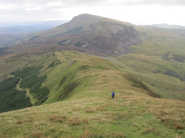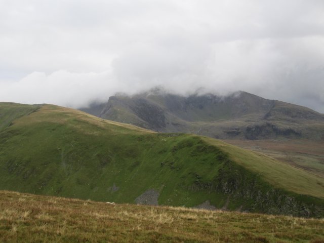 (17) Heading down from Foel Goch looking east towards the dark mass of Snowdon topped by low cloud. We still had the green whaleback of Moel Cynghorion to climb to finish the day's fourth summit.